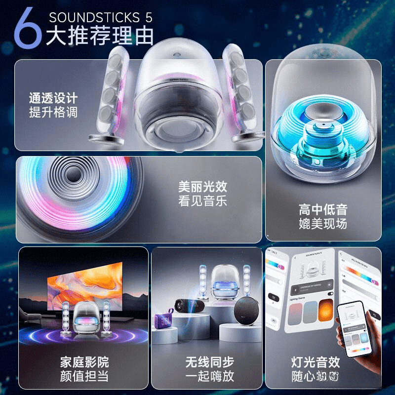 一句话总结:Soundsticks 5 将艺术与音响完美结合,为每个家庭注入灵动与创意。