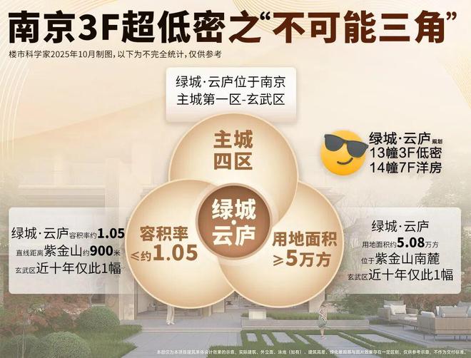 而绿城·云庐,罕见性连中三元:①南京主城第一区玄武区;②容积率约1.05,直线米;③紫金山南麓,用地面积超5万方。等了十年,才等来一座承载3F低密的绿城·云庐,恰好它又在紫金山下,稀缺性不言而喻!