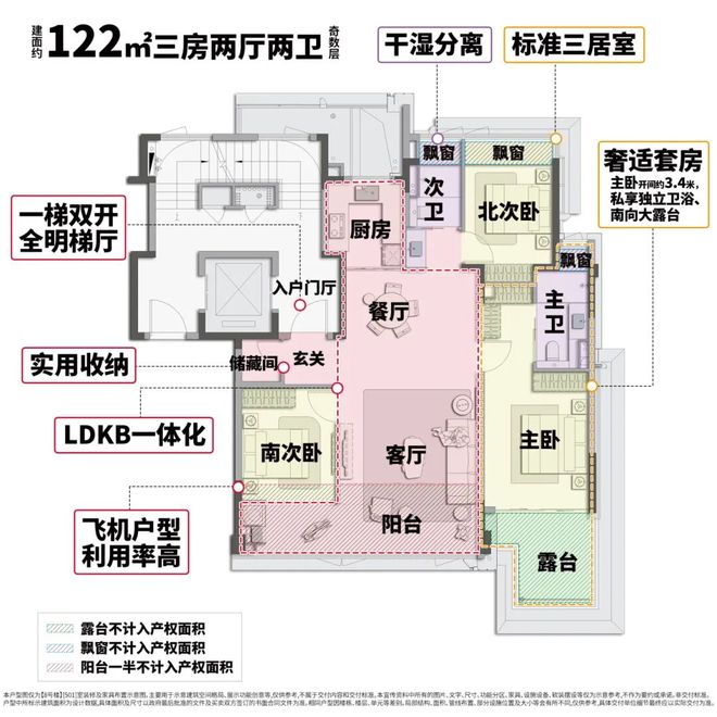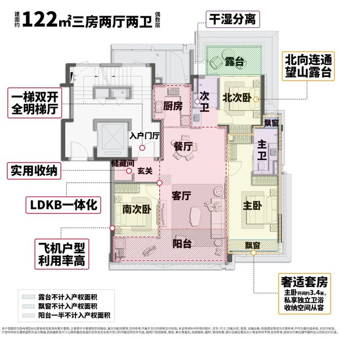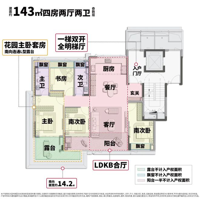 一梯双开+全明梯厅,归家从容私密。洋房得房率本就高,飘窗、挑空平台、阳台一半等均不计入产权面积,使用率超高,同时又是飞机户型,格局方正,无空间浪费。